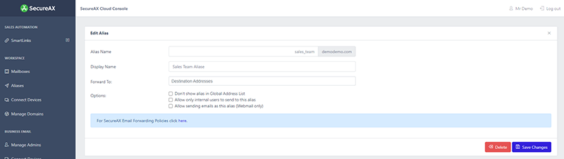 To delete the Email Alias, simply click on Delete and Confirm Delete.